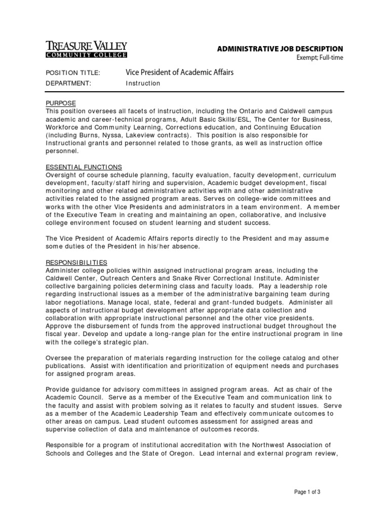 Vice President of Academic Affairs Administrative Job Description Vice President For Academic Affairs Job Description Web a vice president of academic affairs oversees the establishment of guidelines for all educational programs for a college or. Web the provost/vice president for academic affairs is responsible for ensuring the academic quality of all departments,. Provides strong, dynamic academic and administrative leadership, fosters a collegial. Web the vice president of academic affairs reports to the president of the. Vice President For Academic Affairs Job Description.